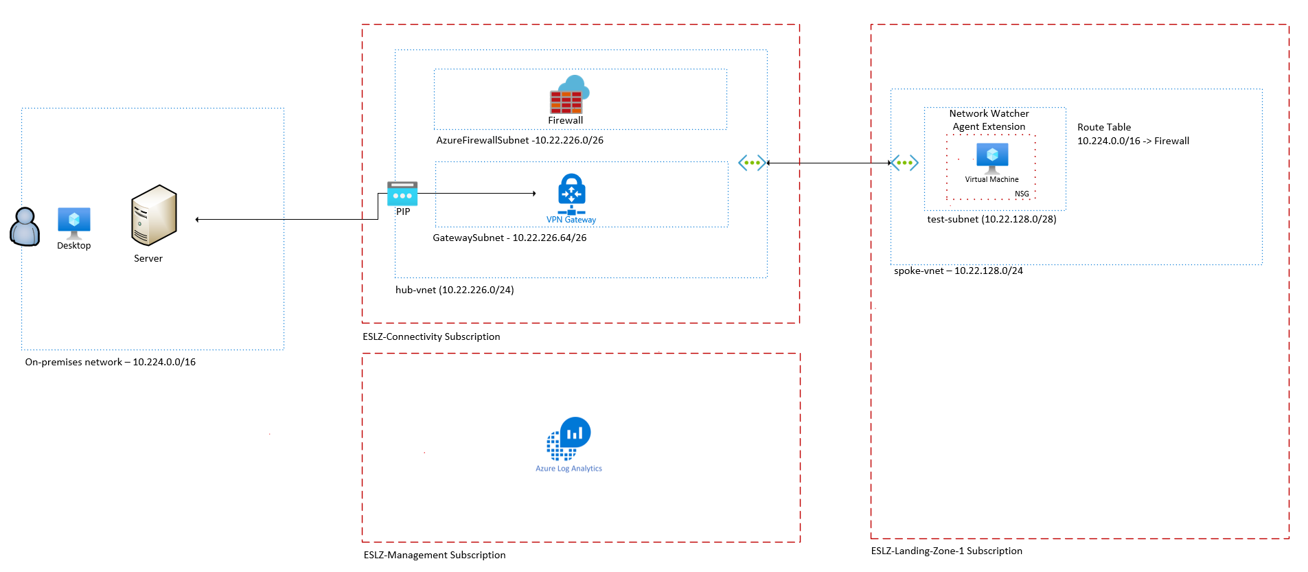 The following image depicts a simple network drawing showing hub and spoke network connectivity back to on-prem via a VPN gateway and an Azure Firewall.