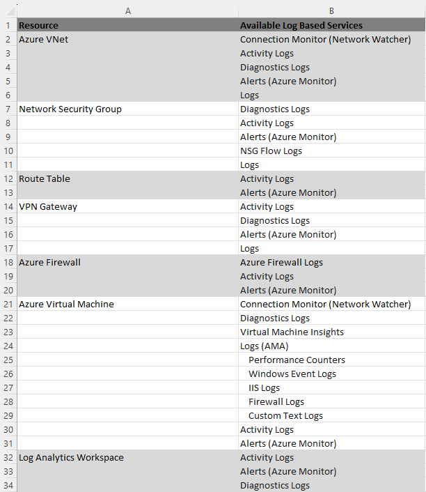 It will take time, but you need to do this as there may be a log that is vital to you. Looking through each of the resources in our networking example we could derive a starting list like this: