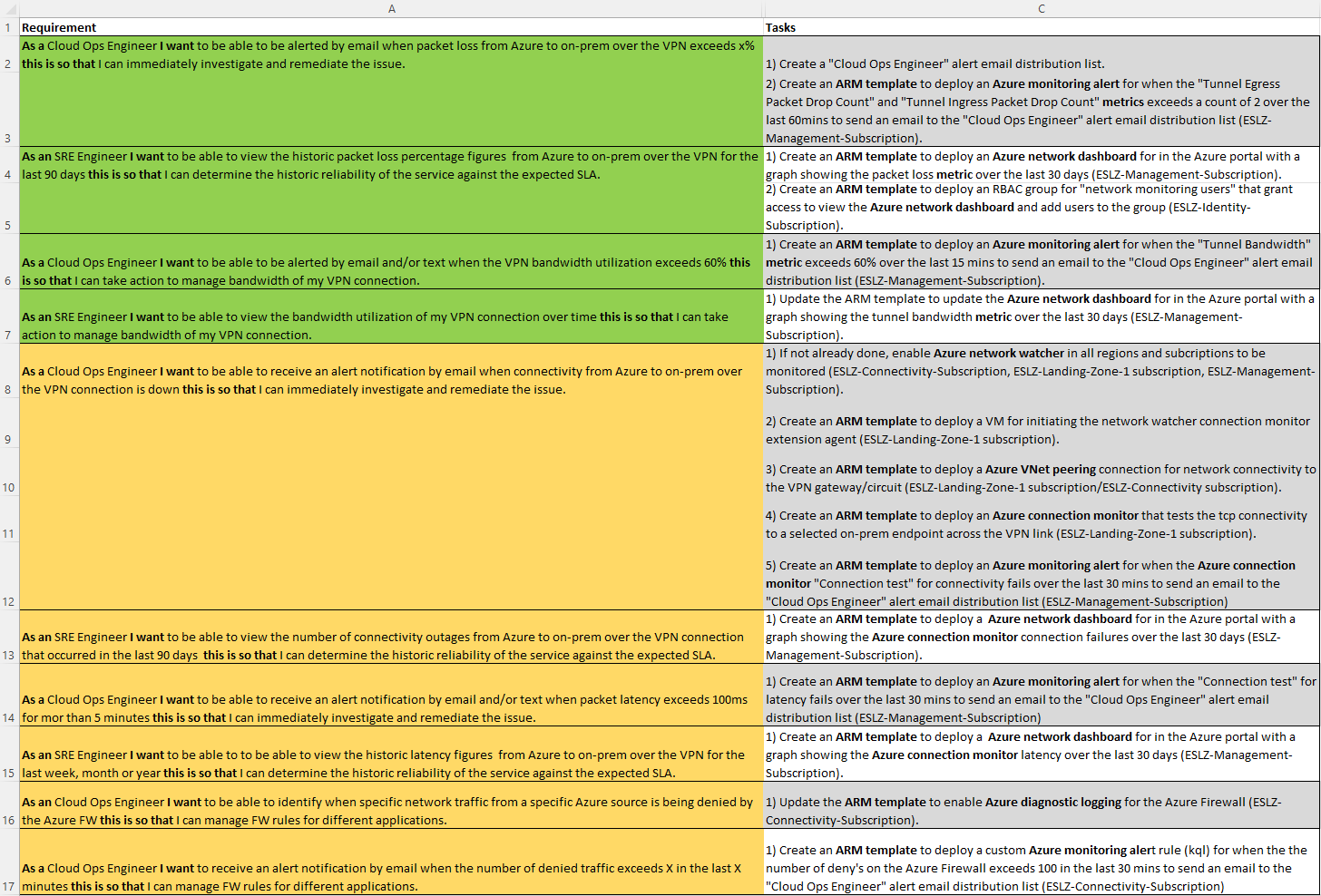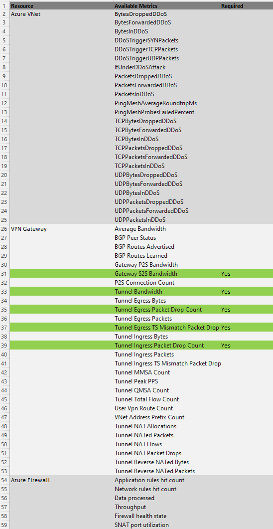 So, for our networking example here, we could map some of our requirements to Azure metrics and logs as below, where the green highlights are showing where a metric can meet a requirement from the requirements list and the yellow where an alternative log base solution is required: