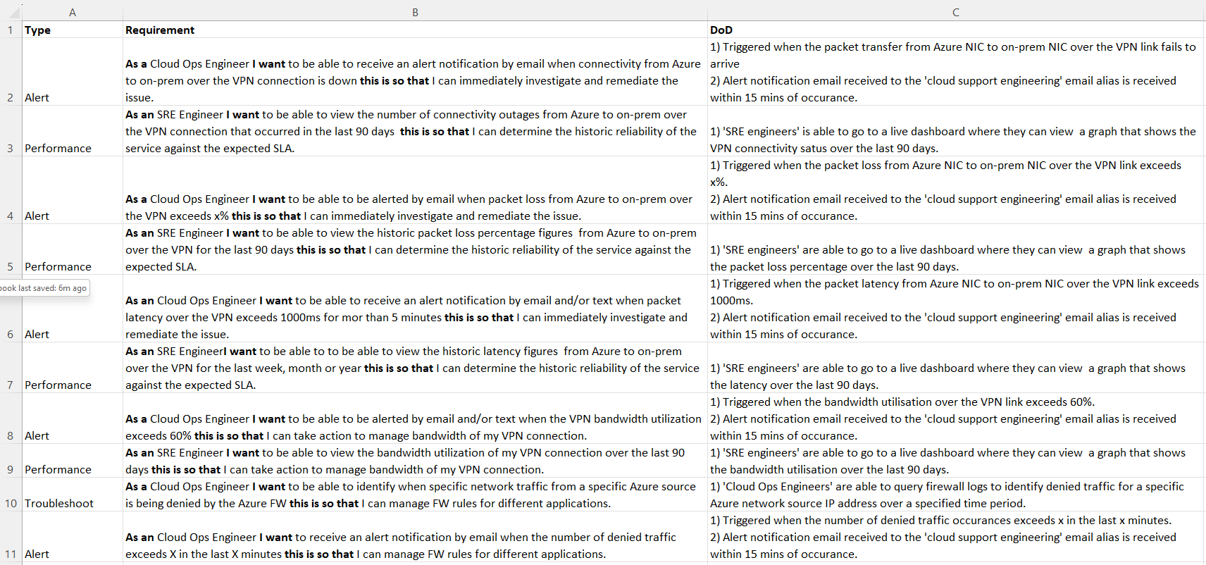 As a starting point, you should consider making a list of these ‘User Stories’. A User Story is an end state that describes something as told from the perspective of the person desiring the functionality. It is widely used in software development as a small unit of work. You can then categorise your stories into different sections together with a success criteria referred to as ‘Definition of Done’ (DoD). This approach works very well for monitoring requirements. Here are some suggested category examples, and you may want to add some of your own:
