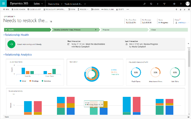 • Dynamics 365 for Sales, we are adding a new Relationship Insights capability that takes rich signals from Office 365, and Microsoft Dynamics 365 to automatically determine the relationship health of a customer and deliver contextual insights that assist the seller in building stronger relationships and delivering a more personalized experience to their customers. These capabilities also help sales people automatically capture related data from Office 365 and track email engagement, and provide alerts and suggest contextual actions to help improve engagement with prospects.