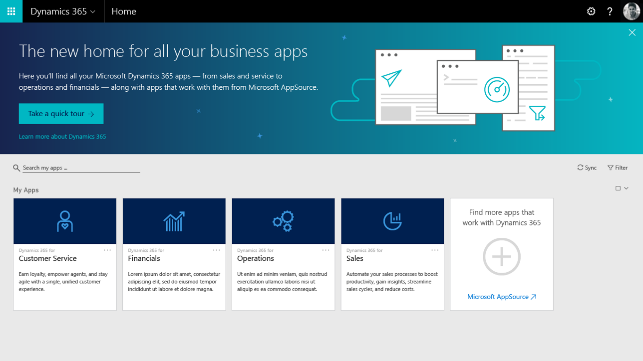 And when a user logs into Dynamics 365, the home-screen will show you all the Business Apps and information relevant to you or your role. With one click, users can connect to Microsoft AppSource, quickly and easily locating the most relevant capabilities from hundreds of precisely curated additional business apps enabled by our partners.