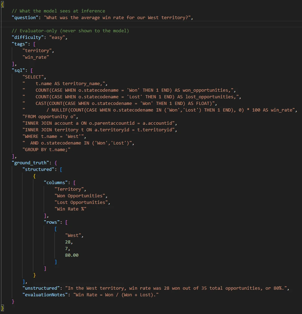 Evaluation needs representative conditions to be useful. Through customer engagements, Microsoft identified numerous edge cases from highly customized schemas, complex joins and filters, and nuanced business logic (like pipeline coverage and attainment calculations).