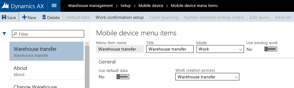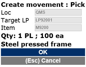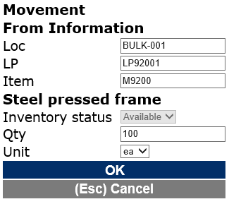 The mobile device menu item for Warehouse transfer is designed for a manual movement of inventory on-hand between locations and/or license plates between two warehouses. As for the manual Movement option, this operation must be processed immediately by the same warehouse worker and the worker will need to define what is going to be moved and from where, as well as specify where to put the inventory on-hand.![]()