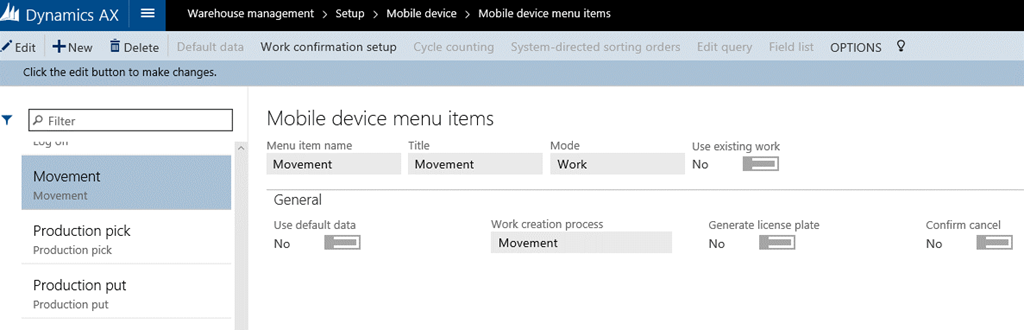 The parameter Create movement can be enabled if the mobile device menu item only should create the movement work, but not process the actual movement. Another mobile device menu item that has the Use existing work option selected can then be used to process the actual movement work at a later point in time.