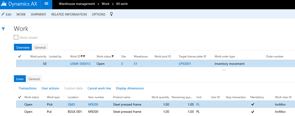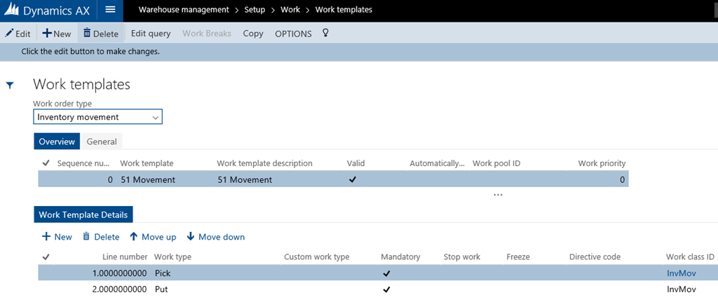 In order for the system to be able to create work, a work template must be defined for the work order type Inventory movement.