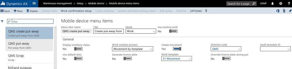 When using the work creation process Movement by template (Use existing work = No), more options exists than for Movement. The biggest difference is that both work templates and location directives will be used to find a put location when using this mobile device menu item.