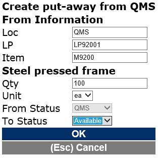 In the example below a new inventory status value named QMS is used.