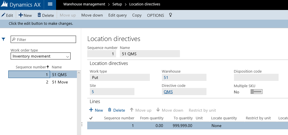 And before the system can find a valid put location during the work creation process, Location directives must also be defined for the work order type Inventory movement.