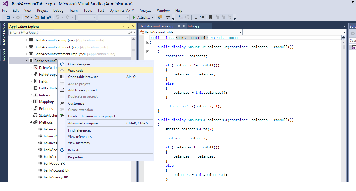 I open up the BankAccountTable and similar to as on the ‘Info’ class I select ‘View Code’ and open the method I am interested in