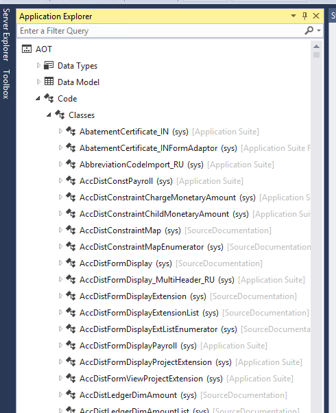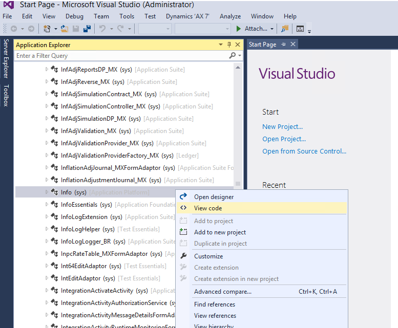 2. Go to the Application explorer, go to the ‘Code’ node, select ‘Classes’ and locate the ‘Info’ class