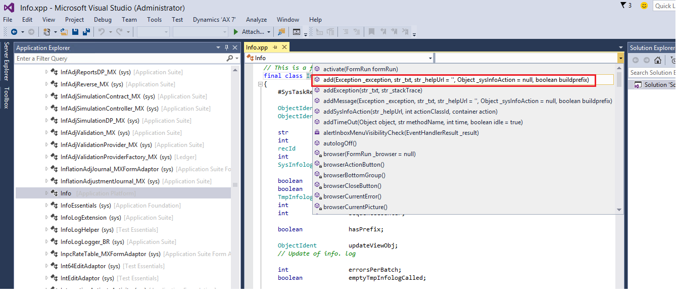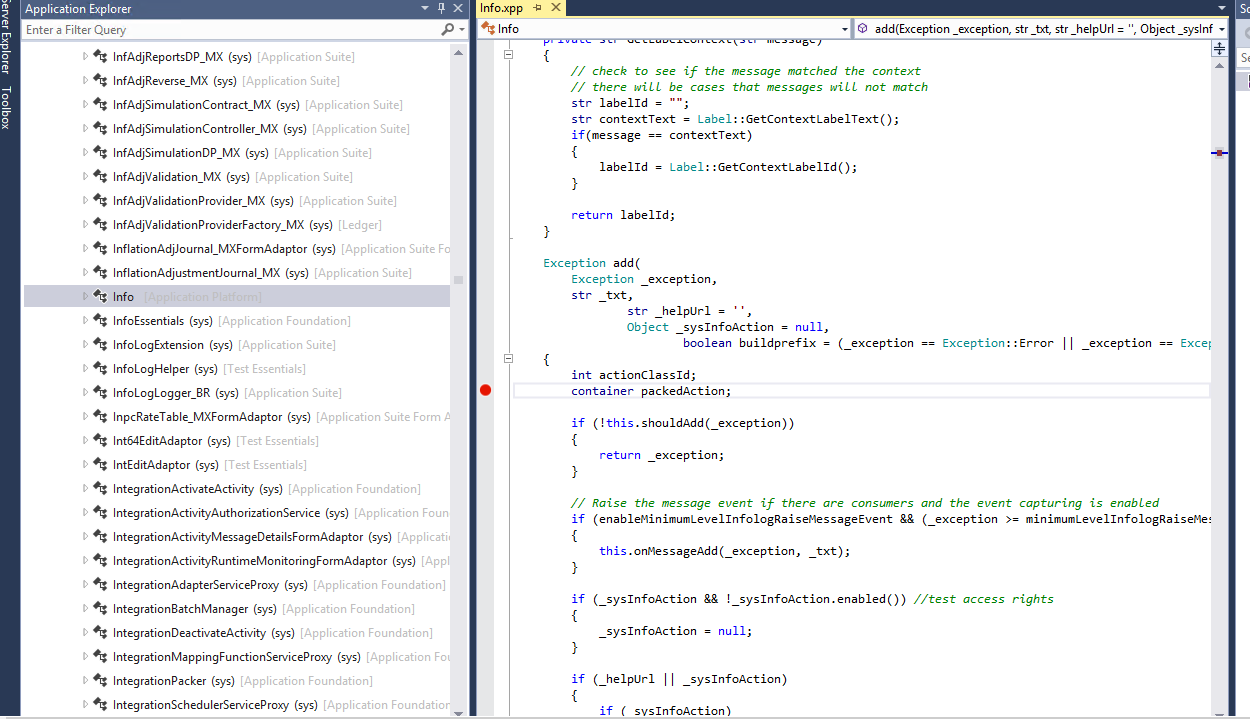 We will use a classic debugging technique known from AX 2012 to demonstrate how this can be done quickly and easily, by inserting a breakpoint on the Info class to enable the debugger to track down in the code where the error is generated from.