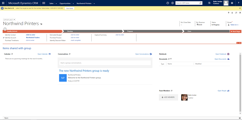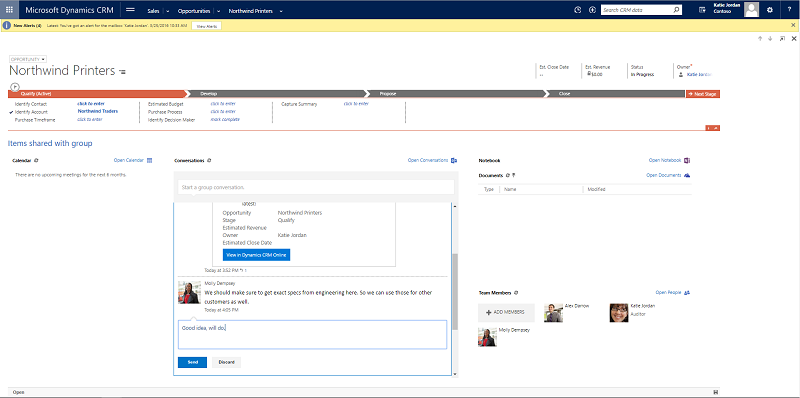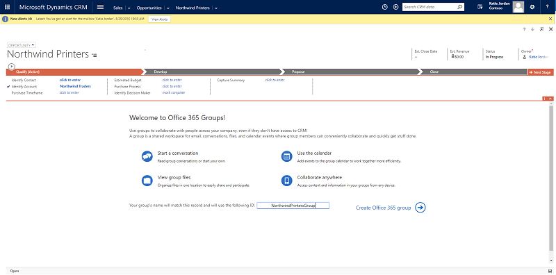 To make the best of your CRM-groups integration, you’d want to configure your CRM record such that you can see bi-directional updates – from CRM to group, and from group to CRM. To achieve this, you should create a group for your CRM record first. For example, you can create a group named Northwind Printers Group for opportunity Northwind Printers in CRM. Learn how to create a group for your record in CRM. This will ensure your group conversation feed shows up right within the CRM record.