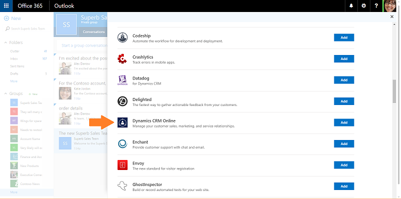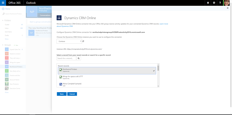 You can then configure the Dynamics CRM Online connector for this group from Outlook Web App. Learn how to add or remove a connector. In the above example, you can go to the Northwind Printers Group in Outlook Web App and add the Northwind Printers opportunity to this group using the Dynamics CRM Online connector.