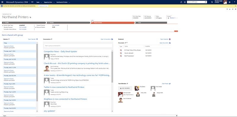 This setup will ensure that any tasks created on the Northwind Printers opportunity in CRM will be sent to the Northwind Printers Group. And any posts in the Northwind Printers Group will be reflected in the Northwind Printers opportunity in CRM.