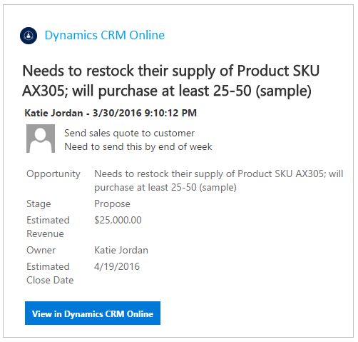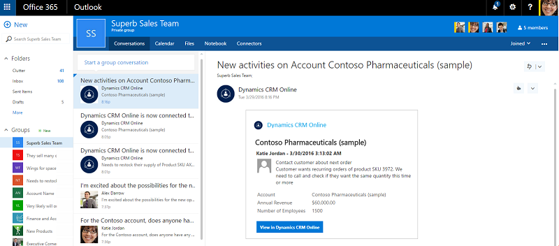 When you connect a CRM record using the groups connector, all task activity for that record is sent to the group. For example, let’s say your group wants to follow what is going on with the Contoso account. You could add the Contoso account as a connector to the group. Whenever any task is created for the Contoso account in CRM, everyone in the group will be able to read and respond to it.