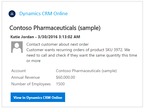 Once connected, the tasks for the connected record are delivered as rich cards to the group. These cards can be viewed in multiple clients including Outlook on the web, Outlook for Windows, and in the Outlook Groups app for iOS and Android. Here’s an example of how the Contoso account card would look like in a group within Outlook: