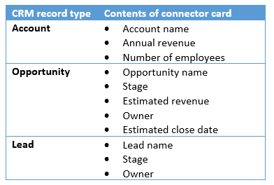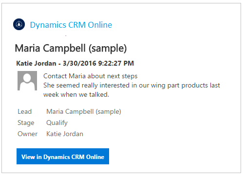 Similarly, you can connect CRM opportunity and lead records to a group. Here are examples of how an opportunity and a lead card would look like in a group within Outlook: