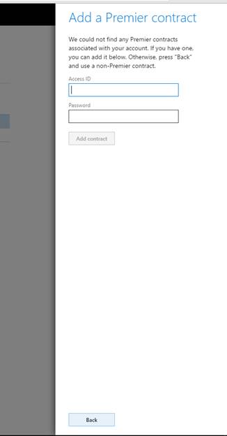 If you have never associated your Access ID with your LCS login credentials, you will be asked to provide the Access ID and password of your Premier support contract. Enter the Access ID and password, and then click Add contract.