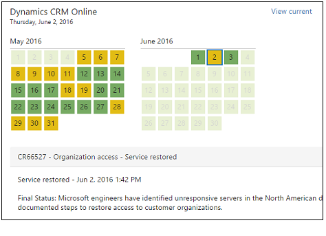 Click View history to see a calendar with the past 30 days of service. Select a date and see service health status and details for that day.