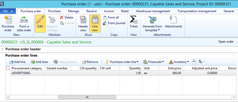 - In the Purchase Order form under Purchase Order Lines fast tab, select ADVERTISING for Procurement Category.