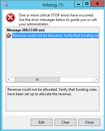 The error: “Revenue could not be allocated. Verify that funding rules have been set up to allocate the Revenue,” occurs.
