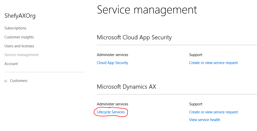 - After you associate the required number of licenses to a customer tenant, click <Customer name> > Service management. For example, if the name of the customer to which you have sold the Dynamics AX license is “ShefyAXOrg”, then you would click ShefyAXOrg > Service management.