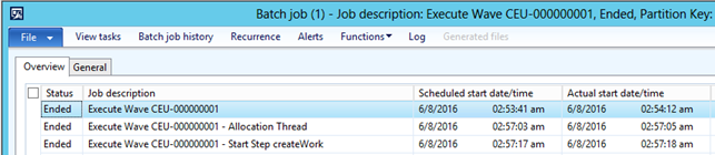The second job is the one for the allocation. This job can have multiple tasks dependent on the number of batch tasks configured. The third job is for the rest of the wave processing and has information about the first step after the allocation. This is typically the createWork step or replenishment if that is enabled.