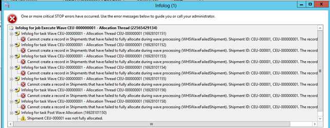 A typical error related to parallel processing could be that two waves try to allocate the same item at the same time and one does not complete so that the other wave is unable to acquire a lock within the specified time. If this situation occurs the batch jobs log will contain information stating that the lock for the item could not be acquired. If this occurs, the wave that failed needs to be processed again.