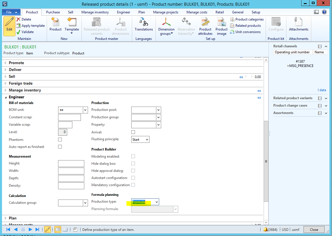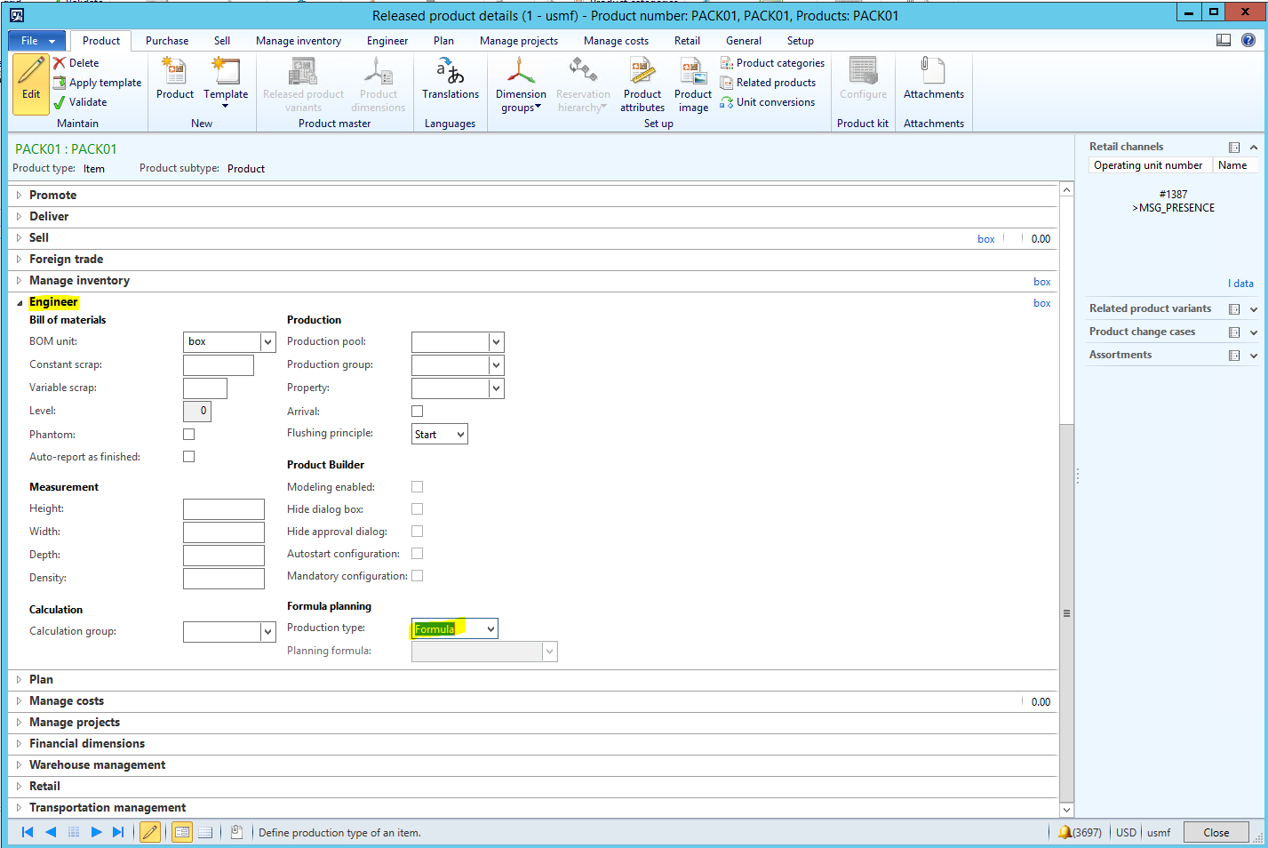 f. In the Released product details form, expand the Engineer fast tab, and select ‘Formula’ in the Production type field.