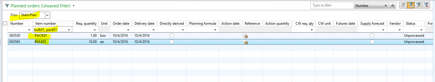 At this point in time, you will see that you have a Planned Batch Order for the BULK01 Item and also a Planned Batch Order for the PACK01 Item. These Planned Batch Orders can be then consolidated and grouped together and eventually firmed into actual Batch Orders.