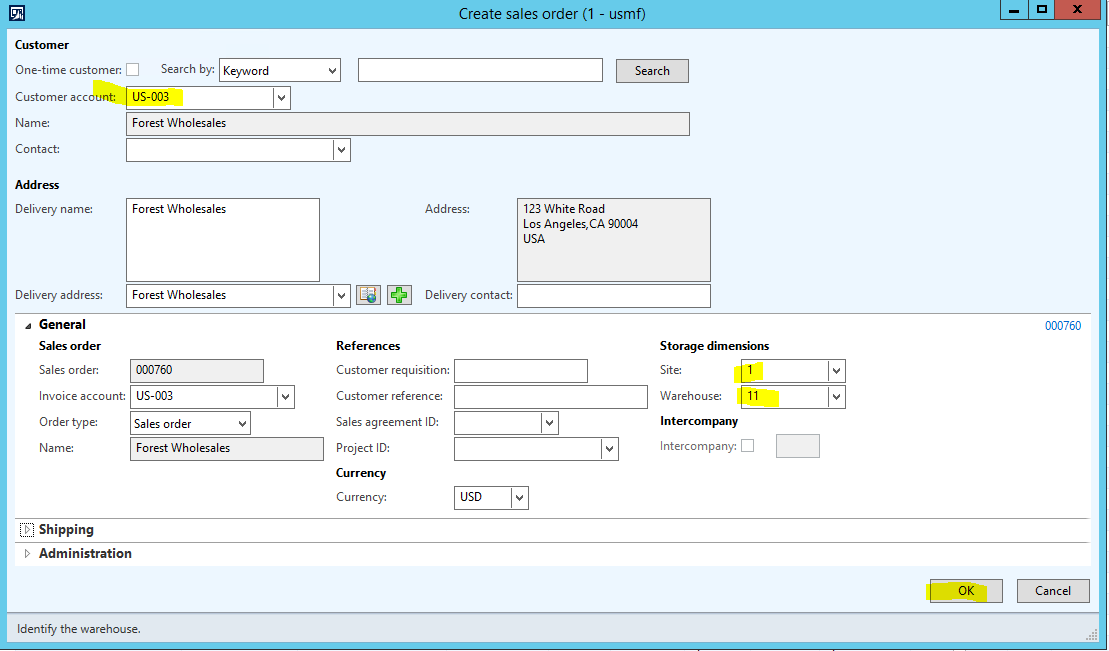 d. In the Create sales order form, expand the General fast tab, and select ‘1’ in the Site field, and ‘11’ in the Warehouse field.