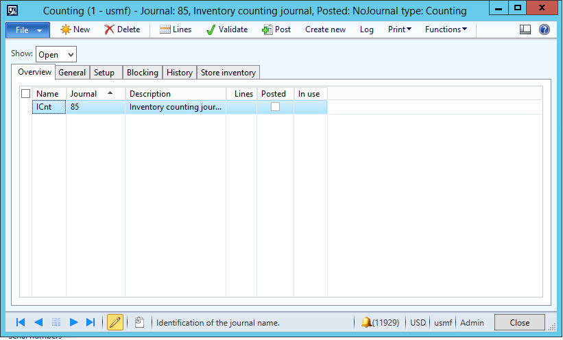 p. In the Counting form, click on the ‘85’ Journal name, and then click the Lines button to open the Journal lines, inventory form.