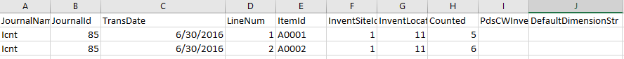 NOTE: In this example, the items that we are importing into the Inventory counting journal (A0001, and A0002) have defaulting Financial dimensions and we have configured our Source Data Format to have the capability to import in the BusinessUnit and Department financial dimension.