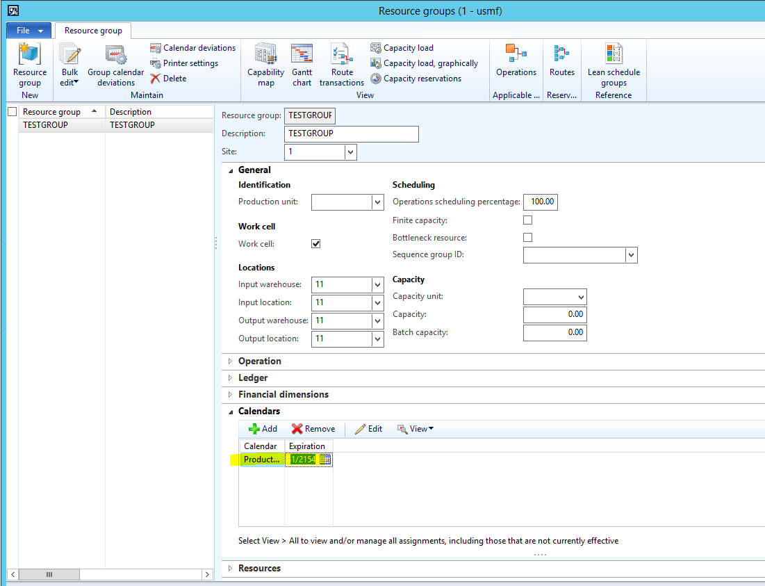 - A Resource group is created called TESTGROUP which is flagged as a Lean ‘Work cell’ and has a Production flow model configured on the Work cell capacity fast tab.