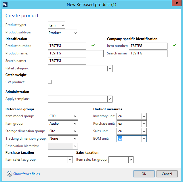 - On the Details fast tab, select ‘TESTFG’ in the Product field.