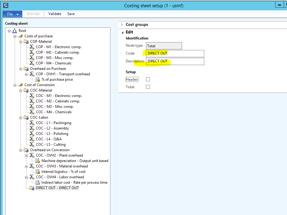 - A Cost Group exists called OUTSOURCE which has a Direct outsourcing Cost group type. The OUTSOURCE Cost group type is added to the Inventory costing sheet.