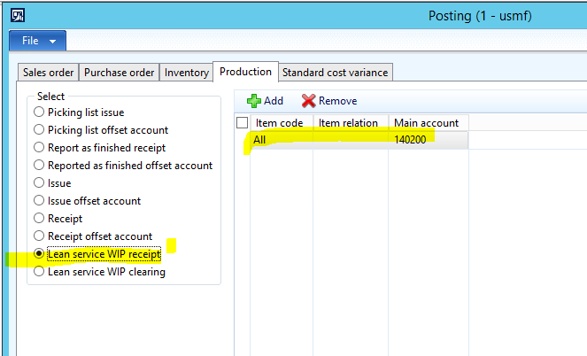 - Click the Lean service WIP clearing radio button, click the Add button, and enter the following line: