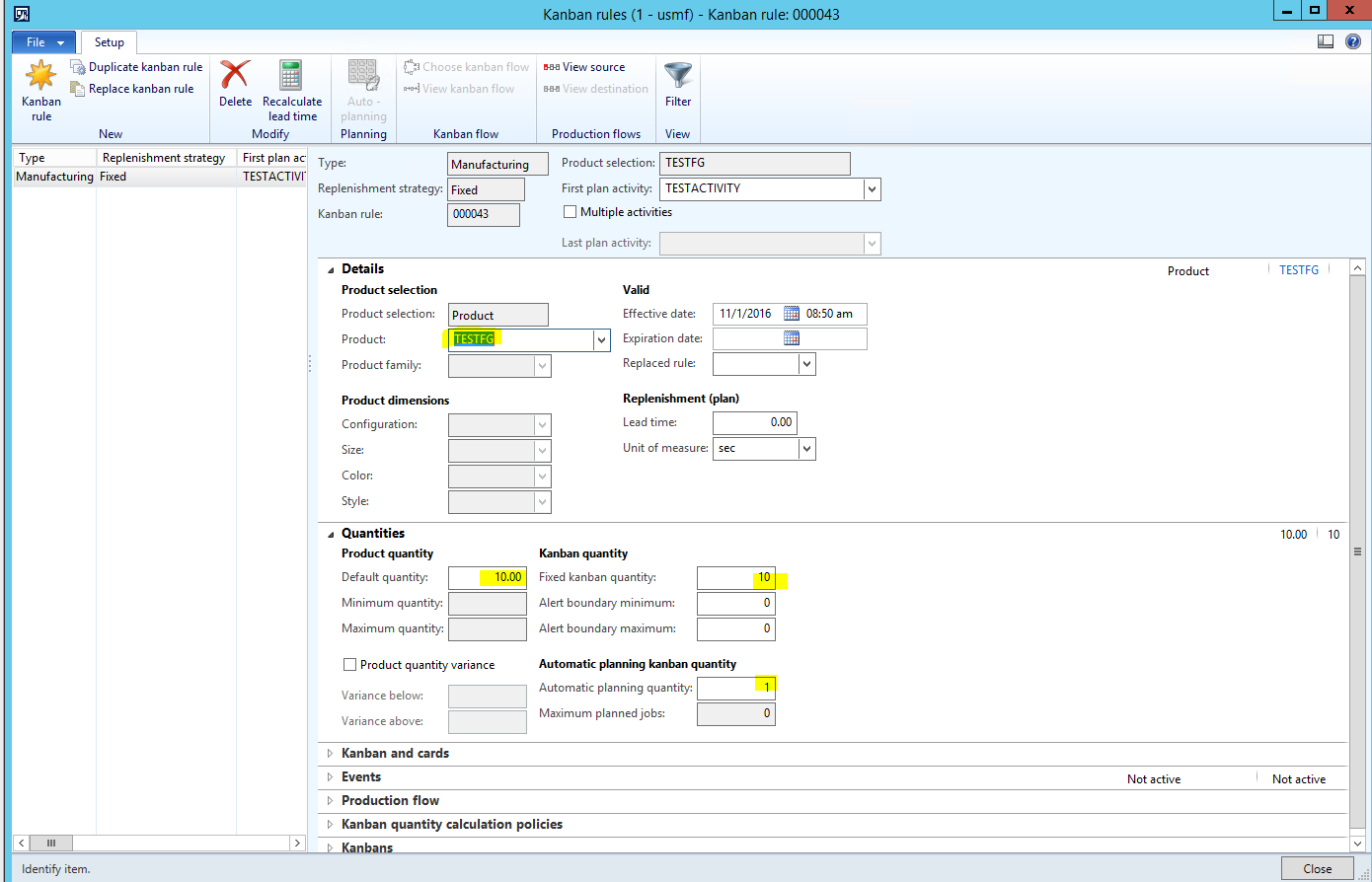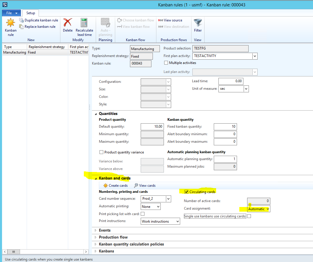 - A Fixed\Manufacturing Kanban Rule is created for the TESTFG Item\Production Flow that we created prior.
