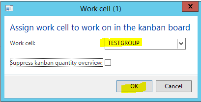 - In the Assign work cell to work on in the Kanban board pop-up form, select ‘TESTGROUP’ in the Work cell field, and then click OK.