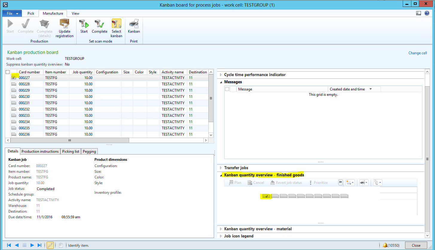 16. Complete manufacturing on the Kanban for the TESTFG item via the Kanban board for process jobs by taking the following steps: