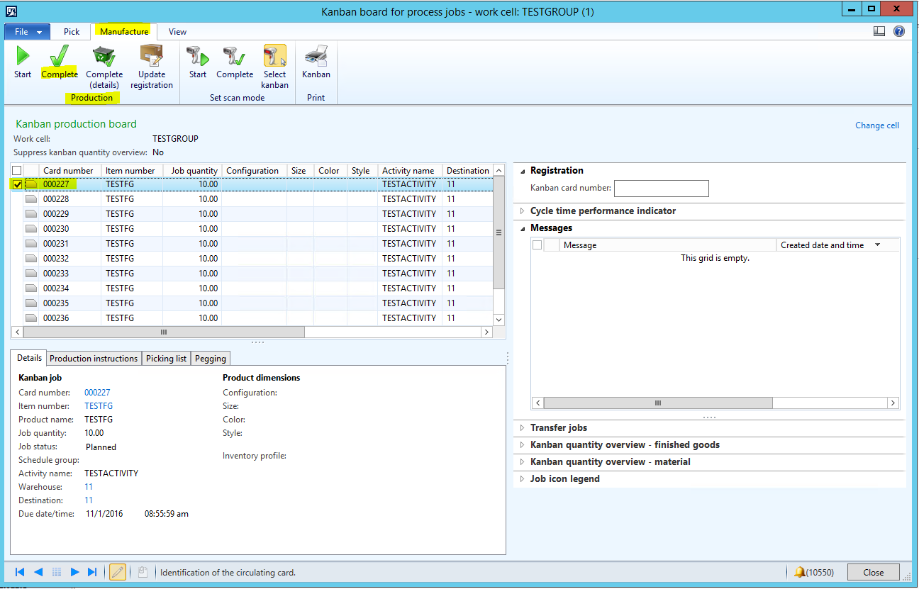 - In the Kanban board for process jobs form, click on the first Kanban card for the TESTFG item, click the Manufacture tab from the Action pane at the top, and then click Production | Complete.