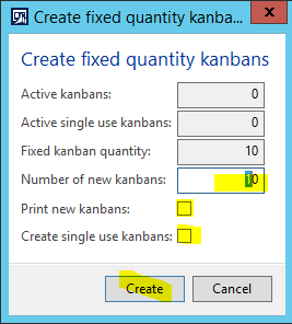 - In the Create fixed quantity kanbans pop-up form, enter the following, and click Create:
