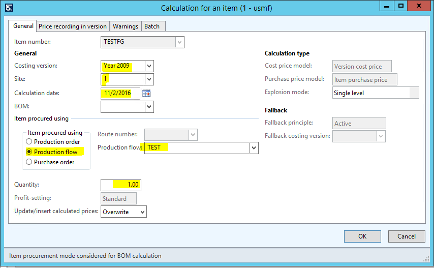 - A Standard Cost Roll\Calculation is performed for the TESTFG Item and a Standard cost price is activated.