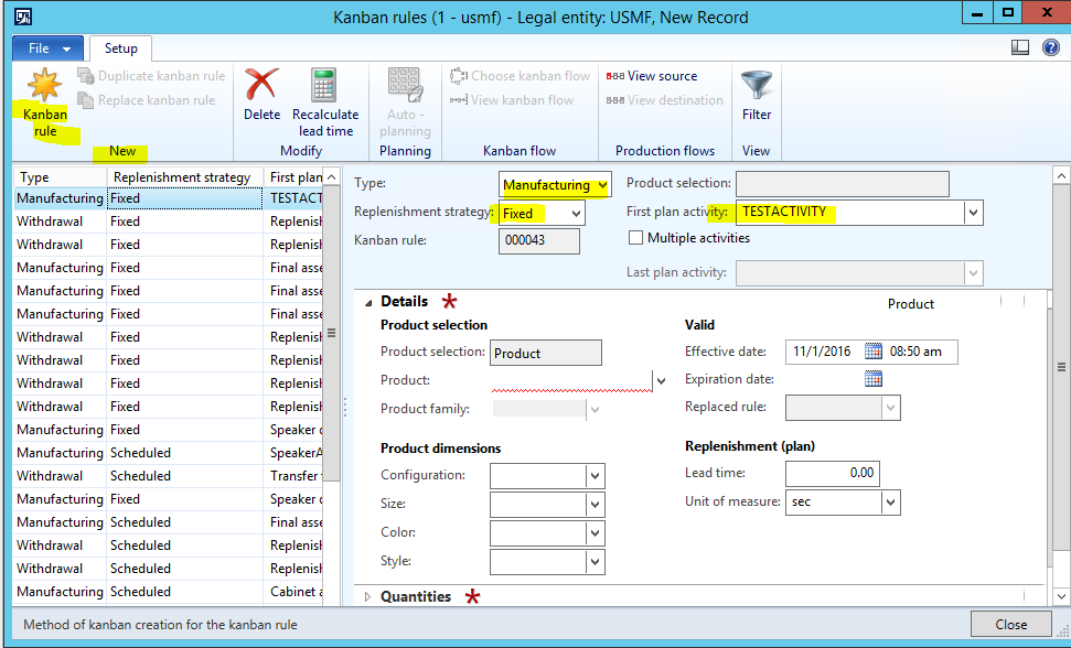 - Go to Production control | Setup | Lean manufacturing | Kanban rules.