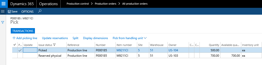 As it can be seen from the above screenshot, the inventory ownership change process automatically updated the Issue field with Reserved physically and Picked and the Owner dimension value is updated to USMF.