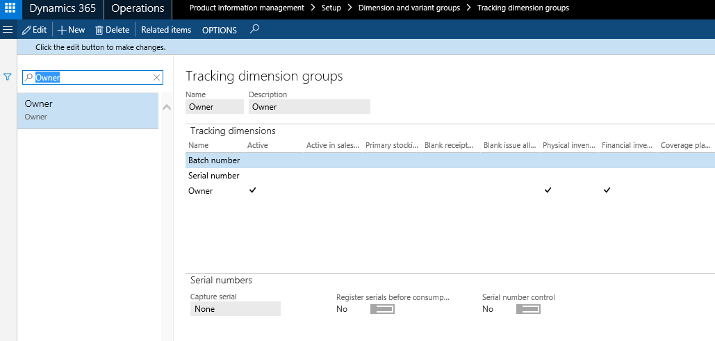 Click Product information management > Setup > Dimension and variant groups > Tracking dimension groups.