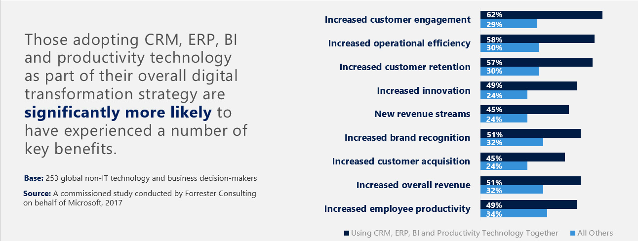A compelling finding in this study was the success being achieved by those organizations that not only had a full digital transformation strategy in place, but had their CRM, ERP, business intelligence and productivity technologies incorporated and aligned. These organizations were experiencing notable gains in key business outcomes compared to others: