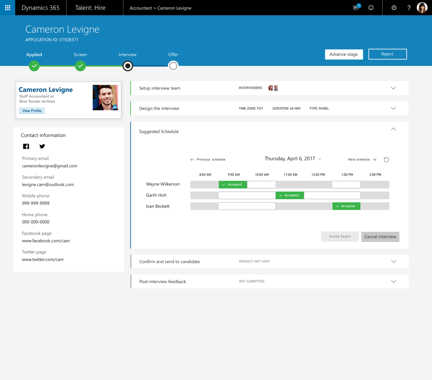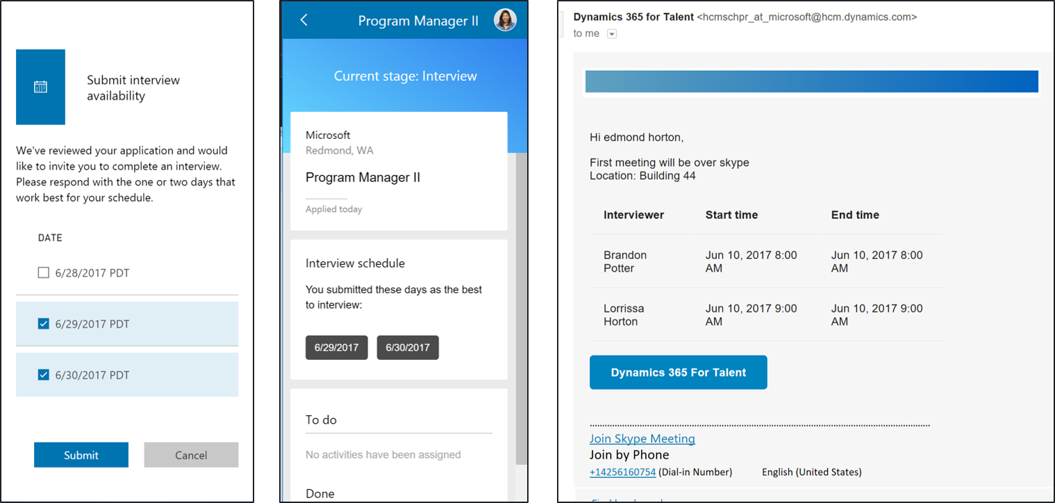 Eliminated the back-and-forth of emails when trying to coordinate interview times between candidates and interviewers. Dynamics 365 for Talent automatically integrates with Office 365 to find the best times for everyone.