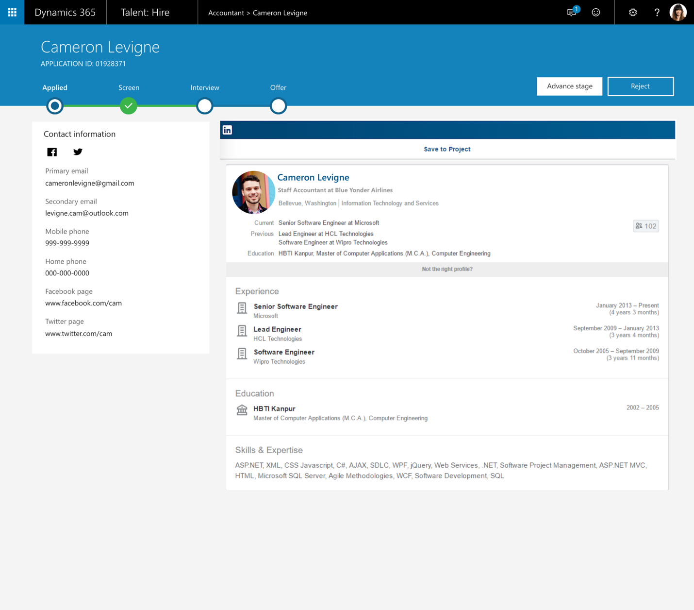 Candidate LinkedIn profiles are automatically integrated throughout the Dynamics 365 for Talent experiences.